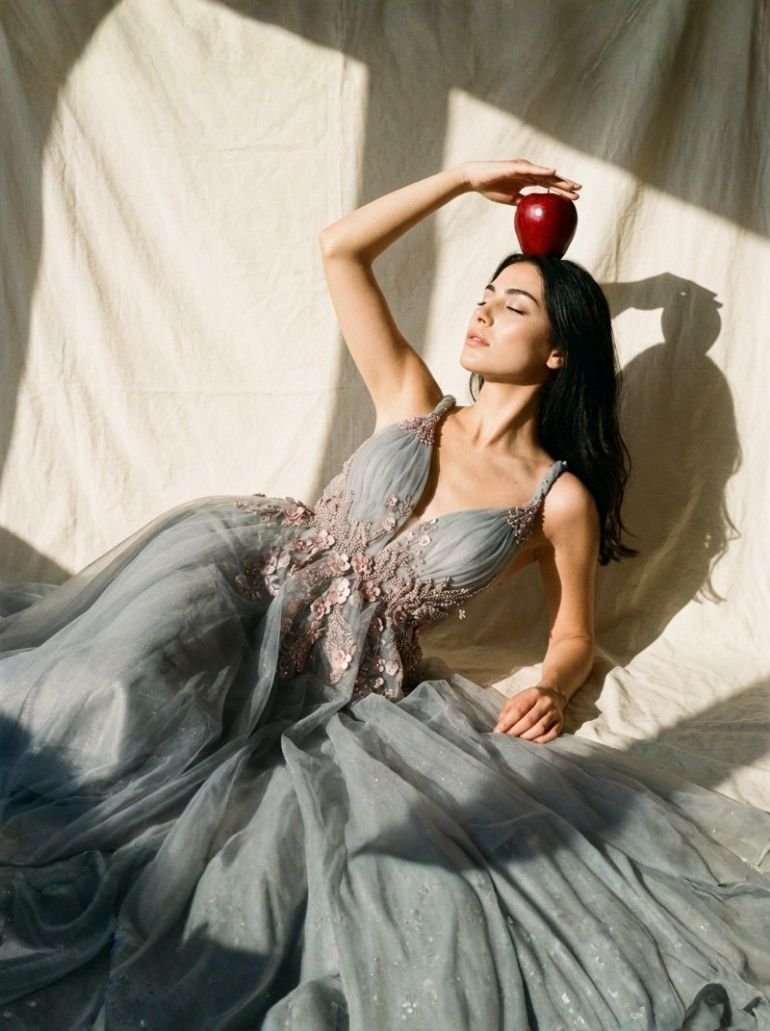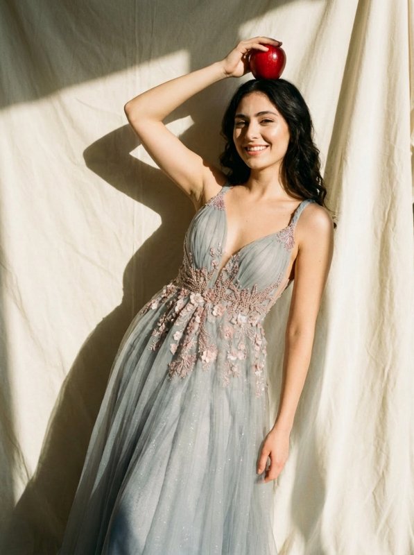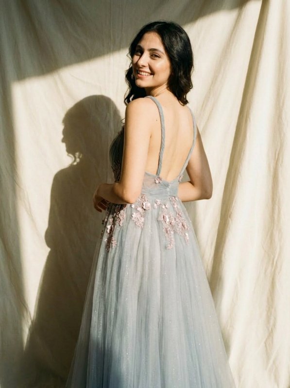 Romantik ve masalsı bir görünüm arayanlar için tasarlanan bu özel parça, pastel mavi tonuyla büyüleyici bir zarafet sunuyor. Üst bedende yer alan ince el işçiliği pembe tonlarındaki 3D çiçek nakışları, bele doğru zarifçe süzülerek eteğe hareket katıyor. Derin V yakası ve şeffaf detaylı gövdesi, modern ve feminen bir silüet oluştururken; kat kat tül etek tasarımı hafif bir prenses kesim etkisi yaratarak her adımda uçuş uçuş bir görünüm sağlıyor.